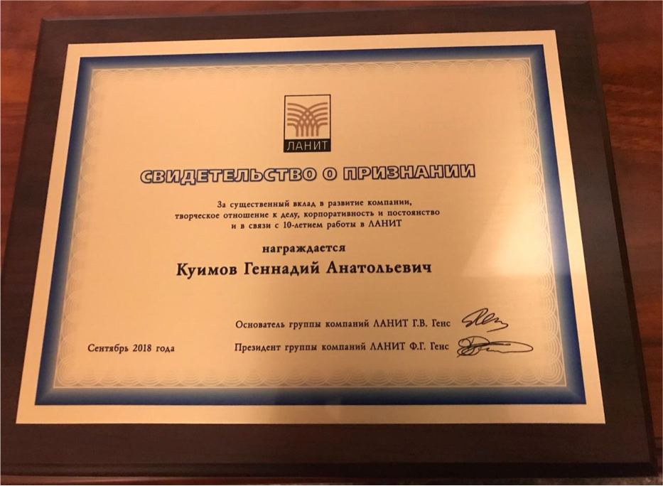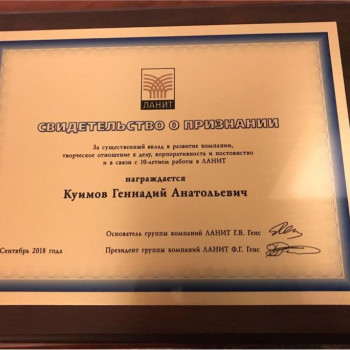 Награда за лучшие продажи в компании ЛАНИТ - оборот 2,5 млрд.$